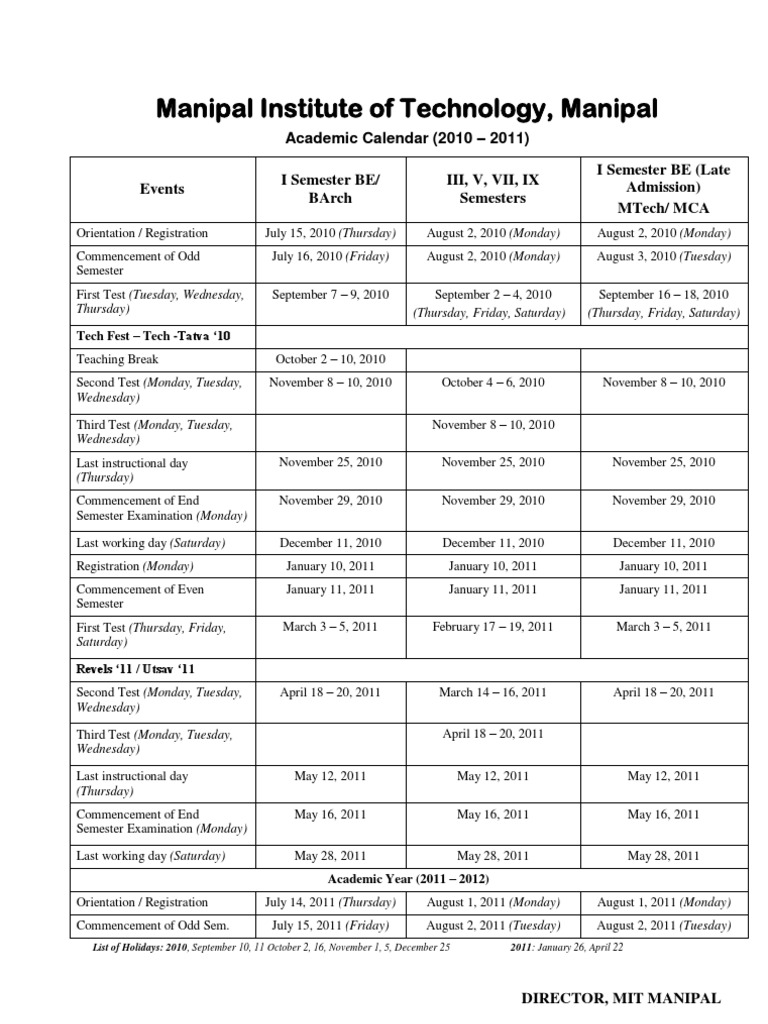 Class Notes Manipal Institute of Technology Academic Calendar 20152016