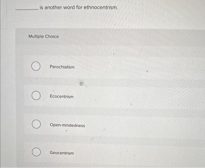 Solved is another word for ethnocentrism. Multiple Choice