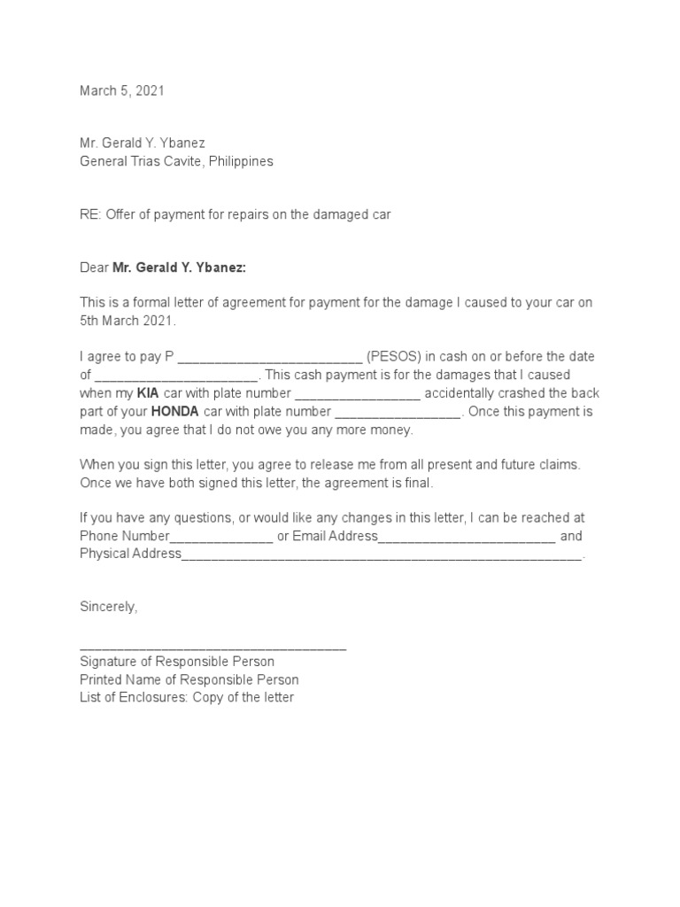 Sample Settlement Agreement Car Accident Settlement Agreement Letter