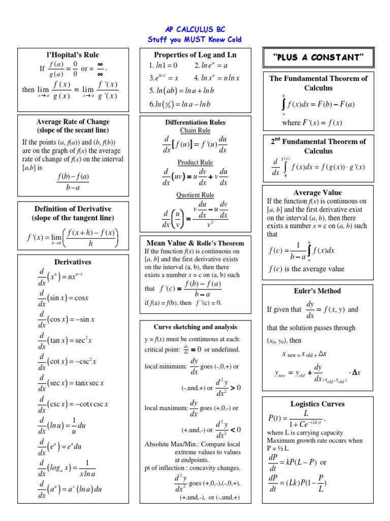 Ap calculus cheat sheet pdf & review chart. Bc calc memorization sheet author: Use this review chart to help you study all of the concepts and important equations for the ap. Find various resources to help you prepare for the ap calculus bc exam, such as notes, cram packets, cheat sheets, and videos. A function f that is continuous on.