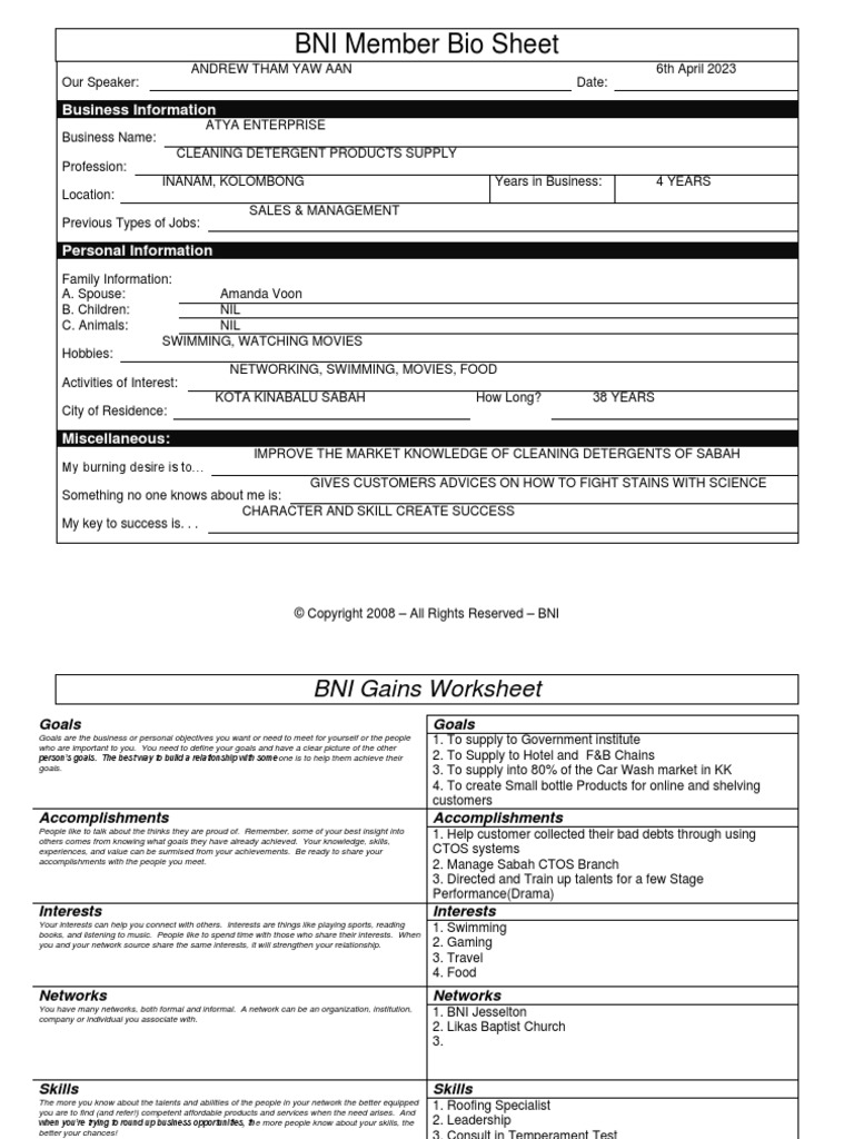 Bni member bio sheet our speaker: Spend more time with the people you already know and concentrate on learning these five essentials: To connect with over 100,000 bni members and help them get the. _____ business information business name: _____ business information business name: