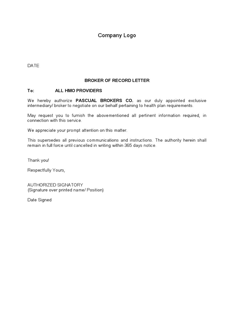 Company Logo Broker of Record Letter To All Hmo Providers PDF