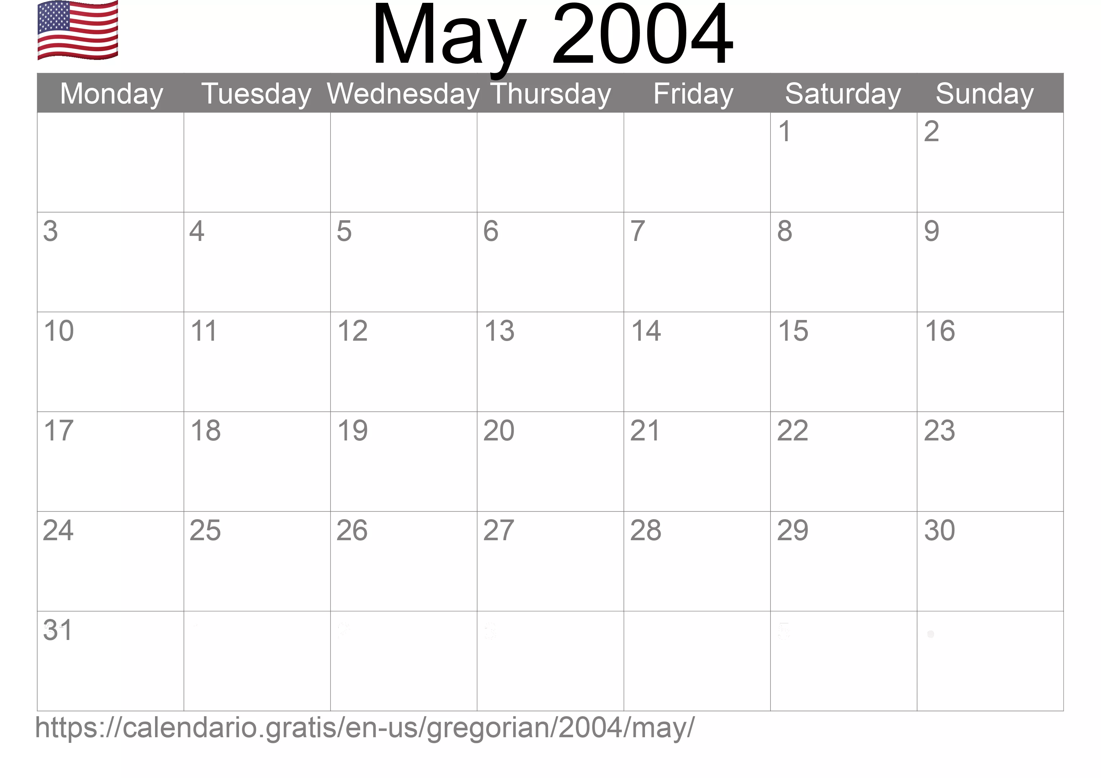 You can create online monthly calendar may 2004 with holidays. And see for each day the sunrise and sunset in may. Monthly calendar online and printable for may 2004 with holidays, observances and more. Download printable may 2004 calendar. Print a calendar for may 2004 quickly and easily.