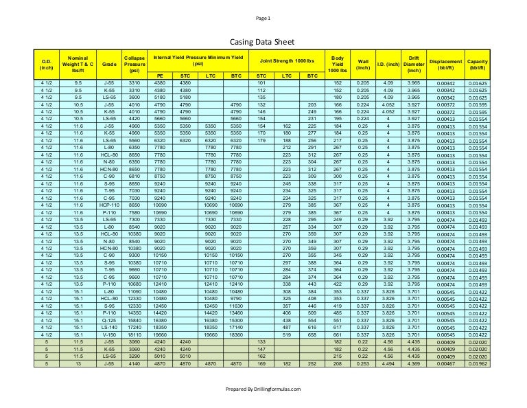 Casing data sheet collapse pressure (psi) grade nominal weight t & c lbs/ft o.d. The api casing specification chart provides specific data that is essential before any operation begins. It includes different casing sizes and capacities that would. In this article, we shall discuss the major casing applications, types, sizes, grades & specifications in detail. (inch) drift diameter (inch) internal.
