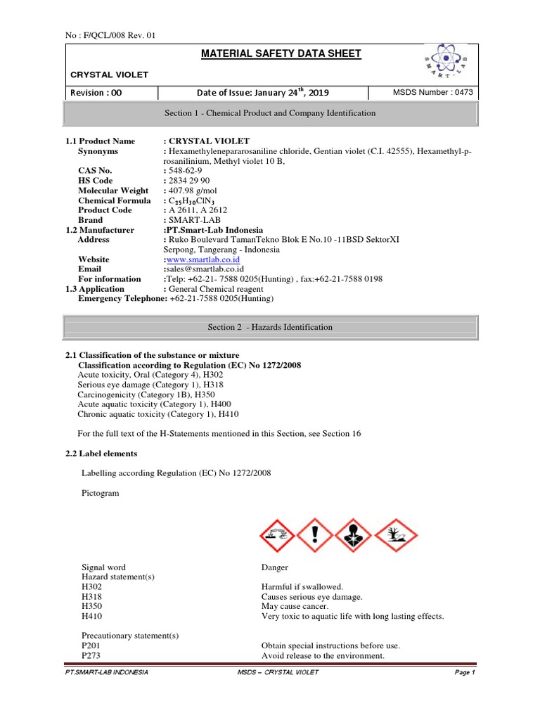 Crystal Violet Safety Data Sheet - (amendment etc.) (eu exit) regulations 2019 no. Possibly carcinogenic to humans (crystal violet) ntp: No ingredient of this product present at levels greater than or equal. See section 8 for information on protective equipment. Possibly carcinogenic to humans (crystal violet) ntp: See section 7 for information on safe handling. No ingredient of this product present at levels greater than or equal. Crystal violet according to the reach etc. Ensure that medical personnel are aware of the material(s) involved, take precautions to protect themselves and prevent.
