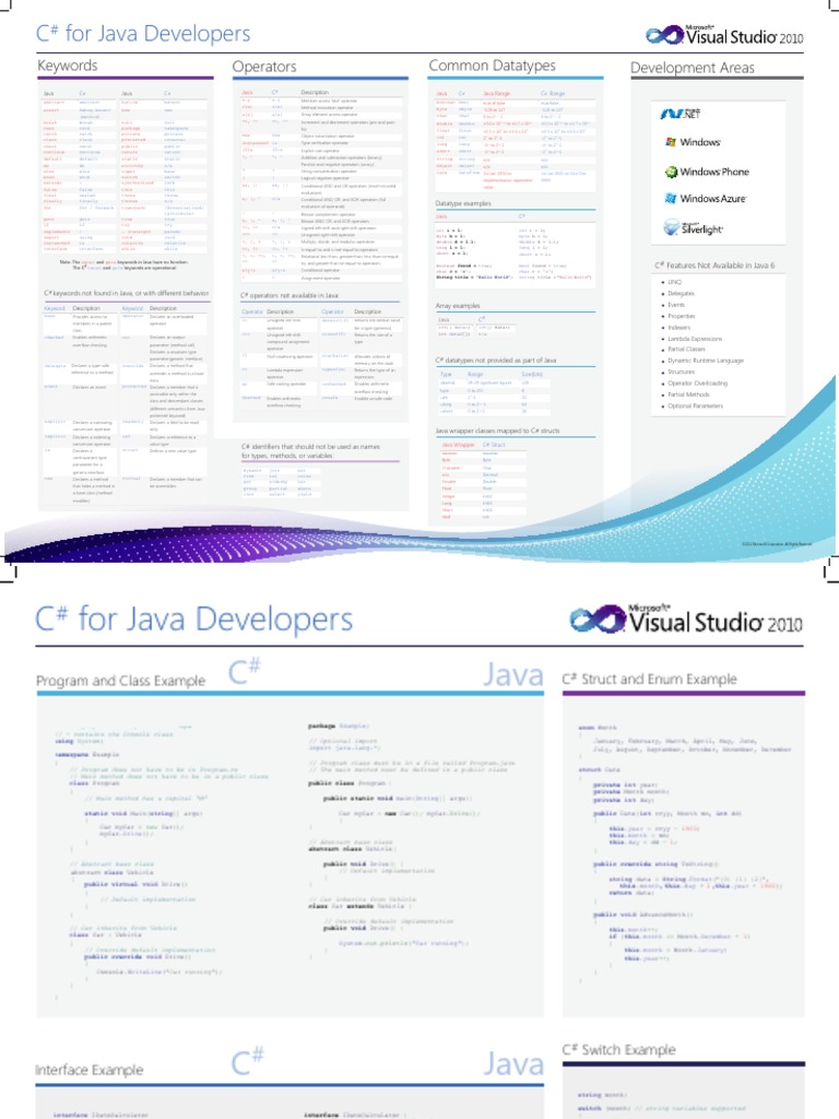 CSharp For Java Developers Cheat Sheet C Sharp (Programming