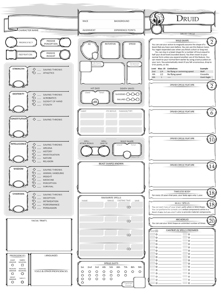You prepare the list of druid spells that are available for you to cast, choosing from the druid spell list. These hand drawn character sheets have been customised to support the fifth edition of everyone’s favourite roleplaying game!. You can assign it to a campaign if you create or join one, for your dm. When you do so, choose a.