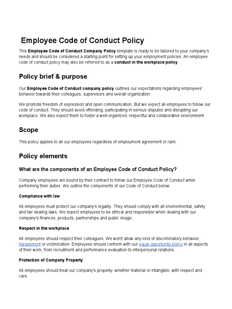 With this employee code of conduct policy template you can: Set up principles to be followed in the organisation;