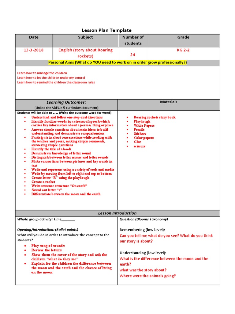 English Lesson Plan Template PDF