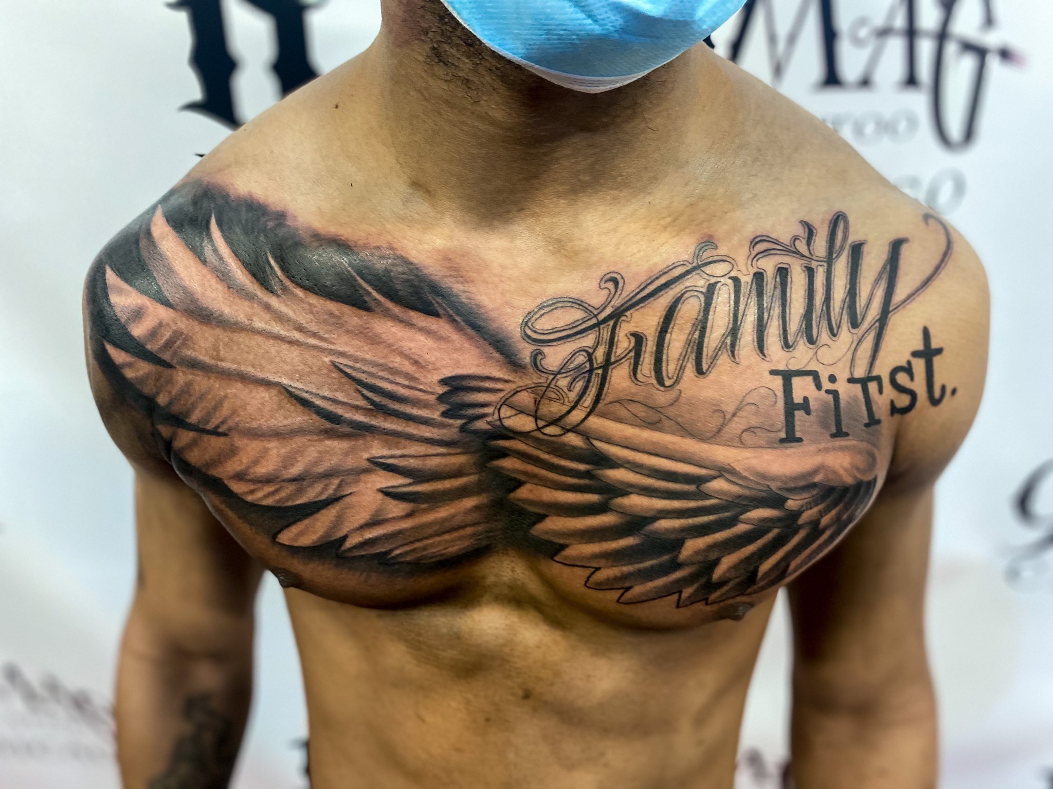 Family First Chest Tattoo - A standout location for a family tattoo is undoubtedly the chest, where a beautifully executed design in black, cursive. Express your love for family with a beautiful chest tattoo. Explore top designs that symbolize the importance of family and showcase your.