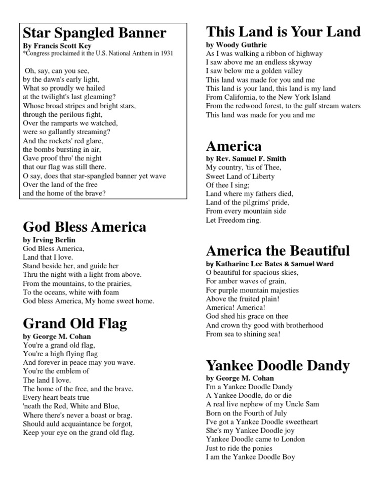 Choose from 10 unique star spangled banner lyrics printables perfect for home, a classroom, or other learning activities. Find lyrics to many popular american patriotic songs for free. Download 10 patriotic songs for children with lyrics and music notes. Browse and print songs like america the beautiful, god bless america,. Sing along with your preschooler and instill a love for.
