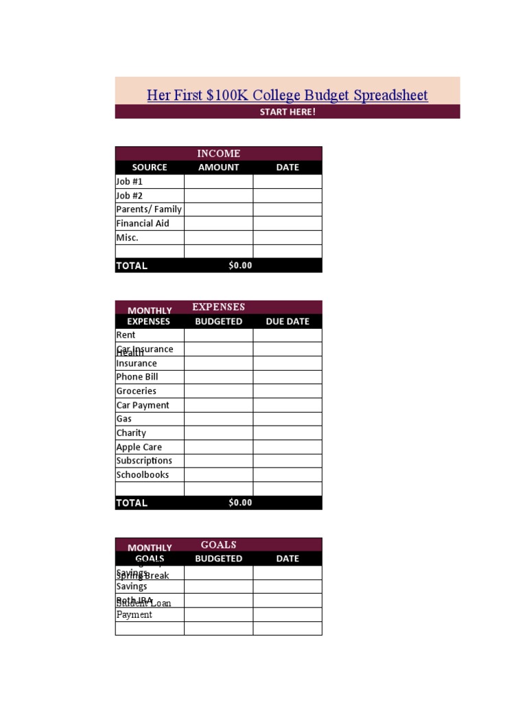 Her First 100K College Budget Spreadsheet PDF