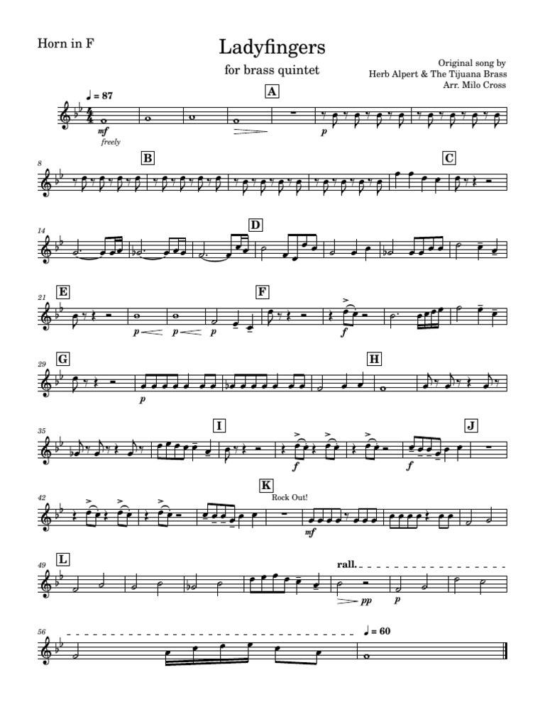 Lady Fingers Trumpet Sheet Music - Music notation created and shared online with flat. Get free ladyfingers sheet music by herb alpert as a digital notation file for trumpet/cornet in f major (transposable).