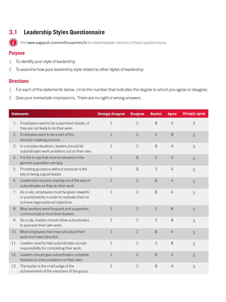 Employees need to be supervised closely, or they are not likely to do their work. There are no right or wrong answers. Leadership styles questionnaire place the score you allocated to each of the numbered statements in the six boxes below, then add up the total. Leadership styles there are many different models of leadership styles, from those that look.