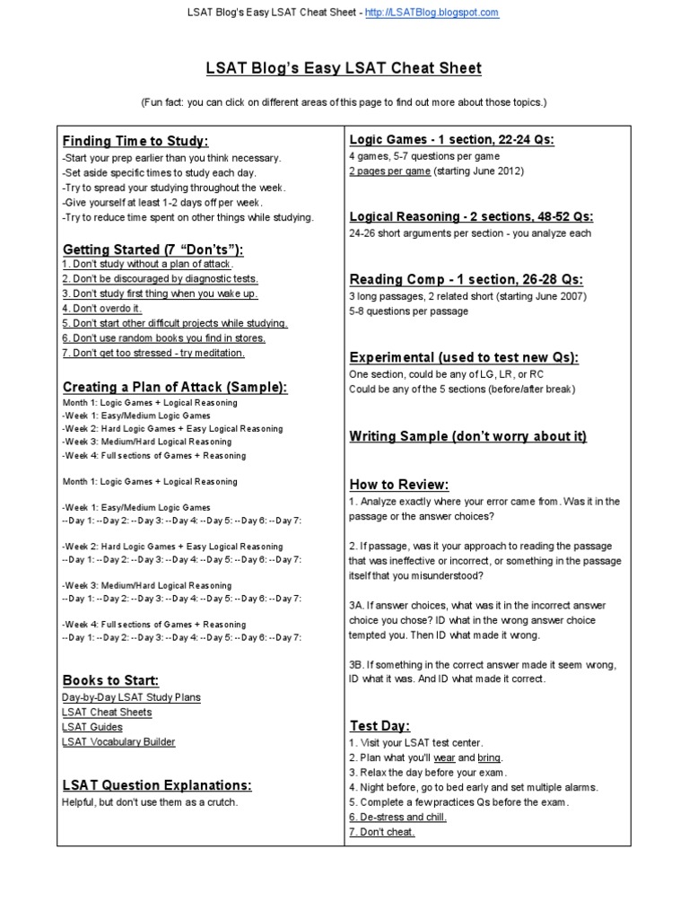 Quickly maximize your efficiency with these proven tips and techniques to tackle challenging questions for each section on the. A score on the law school admission test (lsat for short) is a requirement for admission to almost all u.s. Keep this cheat sheet handy when you practice to make.