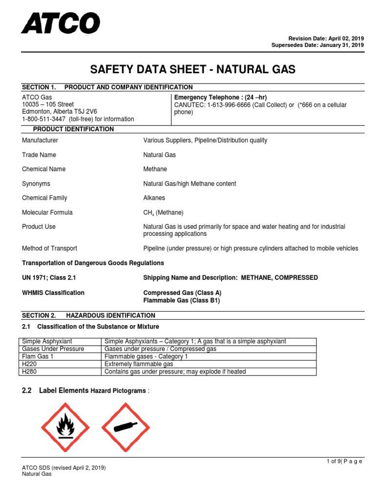 Natural Gas Safety Data Sheet - Violent or explosive reactions can occur between natural gas and strong. Natural gas readily forms flammable/explosive mixtures with air. Keep away from unintended heat, sparks, open flames and hot surfaces. October 11, 2023 deerfoot consulting inc. Do not extinguish, unless leak can be. Safety data sheet section 1: Safety data sheet according to the hazard communication standard (cfr29 1910.1200) hazcom 2012 and the hazardous products. Natural gas safety data sheet date of preparation: Page 1 of 10 section 1: