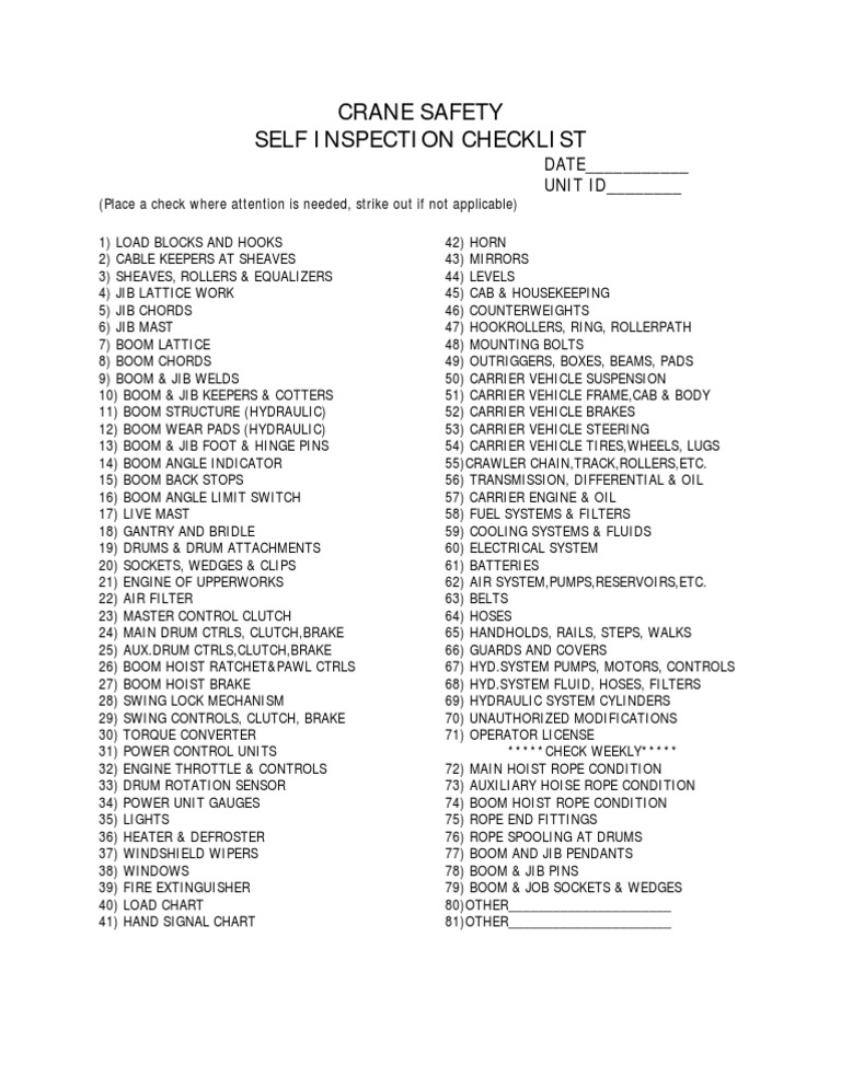 Overhead crane and hoist inspection checklist this file provides a comprehensive checklist. Prior to initial use, all new and altered cranes should be inspected to determine if any safety. Please initial each day of use. Turn completed form in to supervisor at the end of each week.