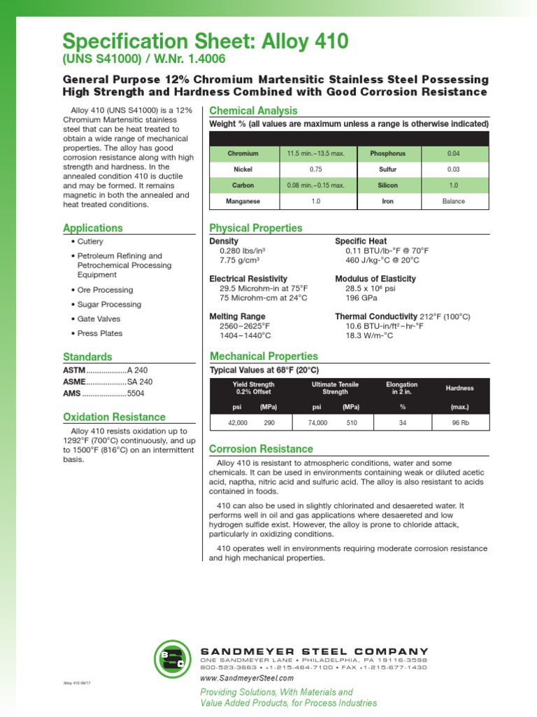 410 Spec Sheet PDF Heat Treating Annealing (Metallurgy)