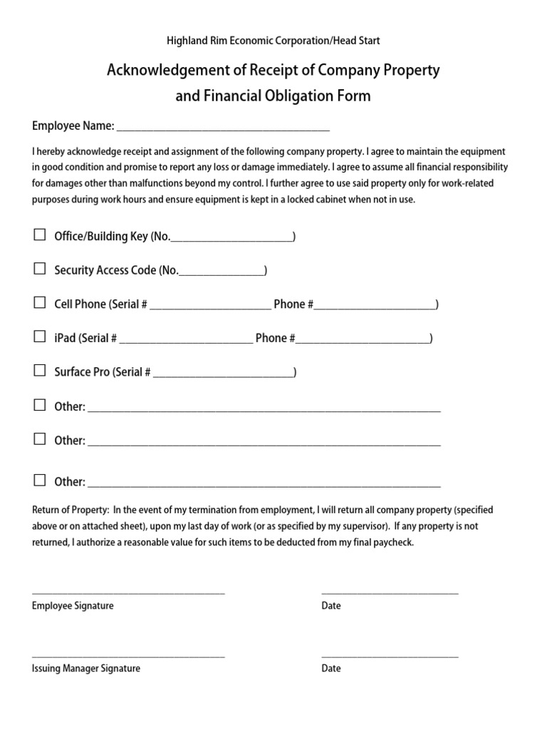 I agree to maintain the. Acknowledgement of receipt of company property and financial obligation form. Download or fill online acknowledgement receipt of company property forms. I hereby acknowledge receipt and assignment of the following company property: Company property acknowledgement of receipt i understand that the company equipment issued.