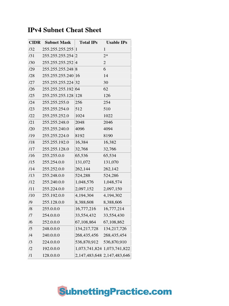 Quick reference crib sheet for daily subnetting tasks. Just scroll or use ctrl/cmd + f to find the value you're looking for. In this subnetting cheat sheet page, you will find all the possible cidr, subnet mask, wildcard mask values for ipv4 addresses. You can use the ipv4 and ipv6 charts for ip address planning and to convert subnet masks.