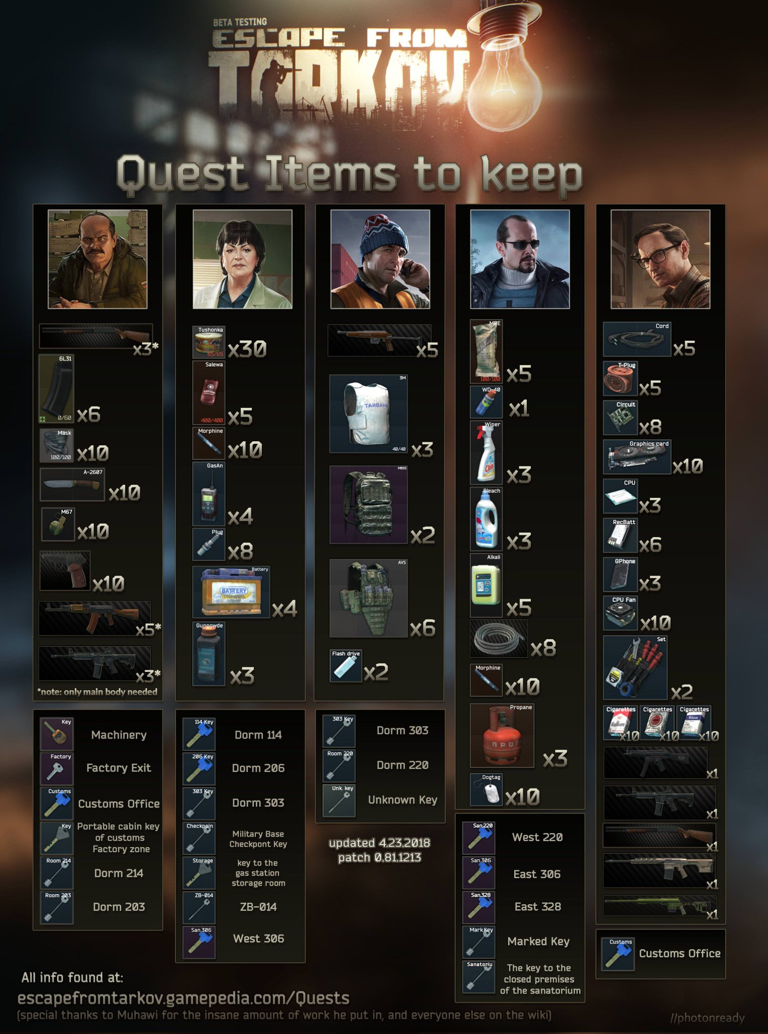 I created this using the tarkov wiki picture with all the quest items listed so credit goes to them. Escape from tarkov quest tree visualization for traders (prapor, therapist, skier, peacekeeper, mechanic, ragman, jaeger, fence), including. This spreadsheet just makes it easier to track. Escape from tarkov quest & hideout item tracker, with prioritized weighted balance for most important items.